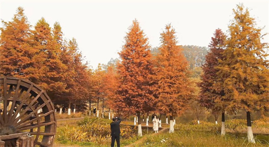 内江五星湿地公园的初冬,是被落羽杉染透的橙红浪漫。高空下杉林偎着湖水,步道旁红杉列队,木水车 ...