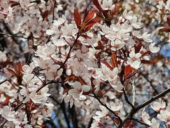 漫步在釜溪河畔、城市公园,或是寻常巷陌,都能与这春日盛景不期而遇。深紫红色的新叶间,缀满了细碎的白色花瓣,如云似雪,在春风里轻轻摇曳。阳光穿过花枝,在地面投下斑驳的光影,偶有花瓣随风飘落,铺就一条浪漫的花径。