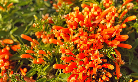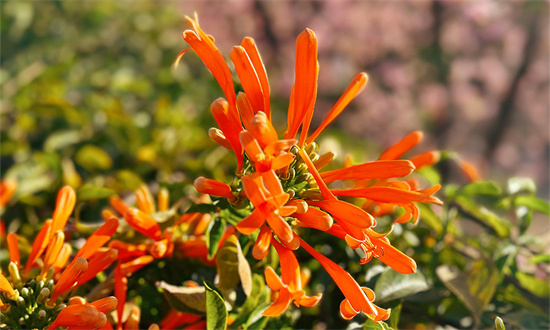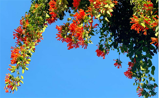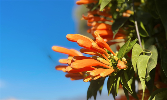 一年伊始,漫步在攀枝花大街小巷,随处可见花团锦簇的炮仗花迎风怒放,满树的橙色显得明艳夺目,美得如此高调。在23℃阳光的照耀下,花序成串,累累下垂,簇簇花朵傲然绽放。花蕾似锦囊,花冠若磐钟,花丝如点绛,宛如一串串红红火火的鞭炮开得喧闹热烈,美得炫目。