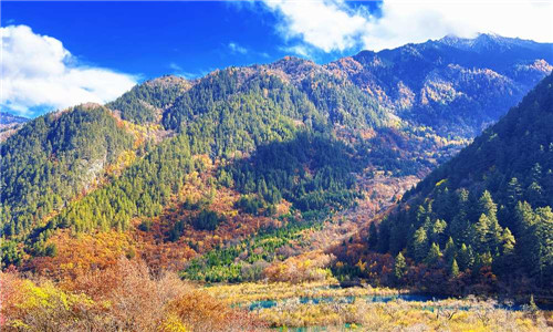深秋的九寨沟,是一幅浓墨重彩的油画。群山披上锦绣,金黄、赤红与墨绿交织,倒映在清澈宁静的海子里,虚实难分,如梦似幻。仿佛天地在入冬前奏响的一支华彩乐章,令人屏息,永生难忘。(文/李镇洪 图/徐华)