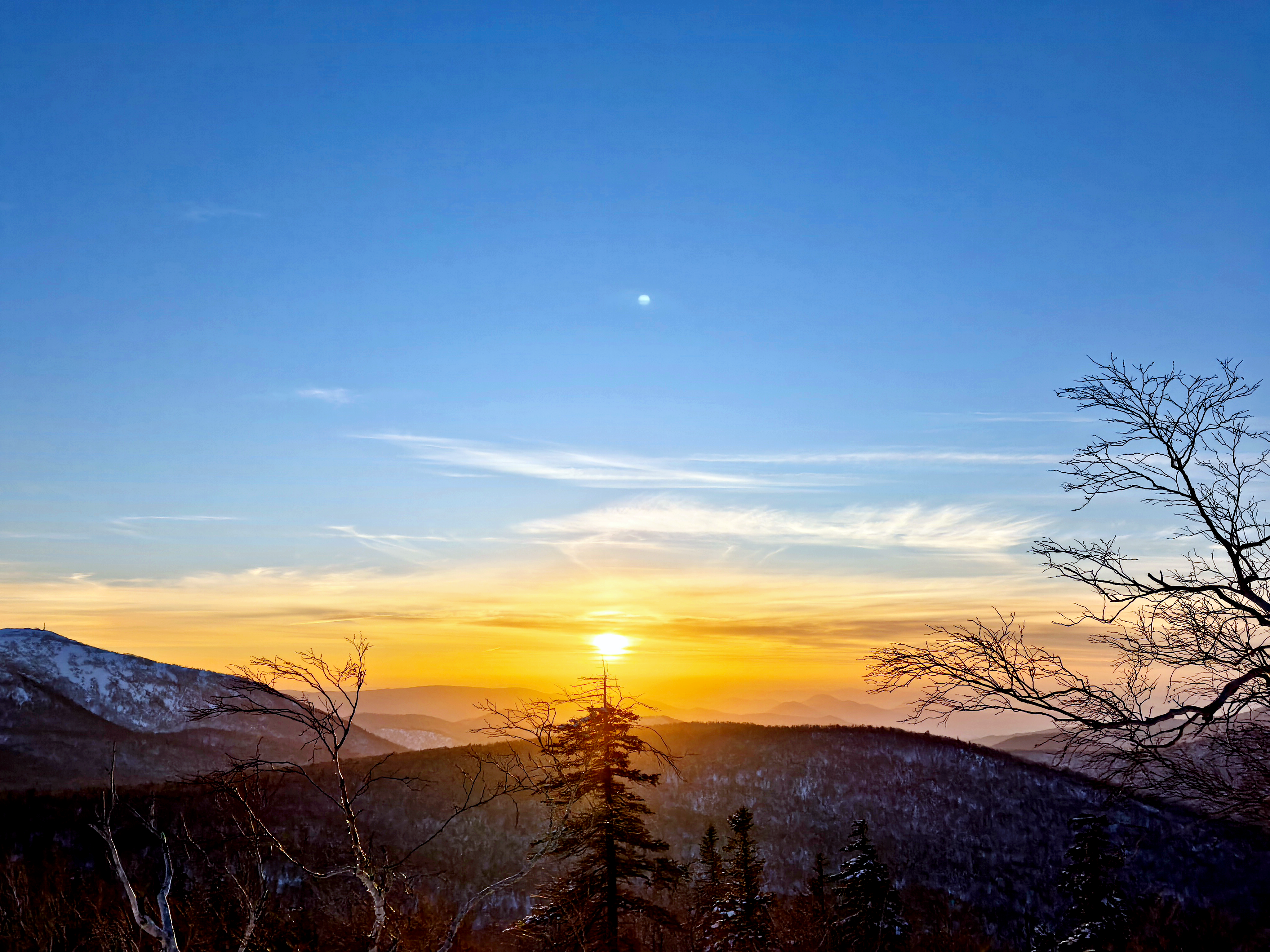 冬日松潘,天地澄澈而静。山林覆着薄雪,溪水在冰边潺潺流淌,映出微弱的光。阳光穿透云层,洒在远处的山巅与林海间,金辉与银白交织成柔和的色调。风拂过树梢,落雪轻散,共同谱写低吟着一首冬日诗。