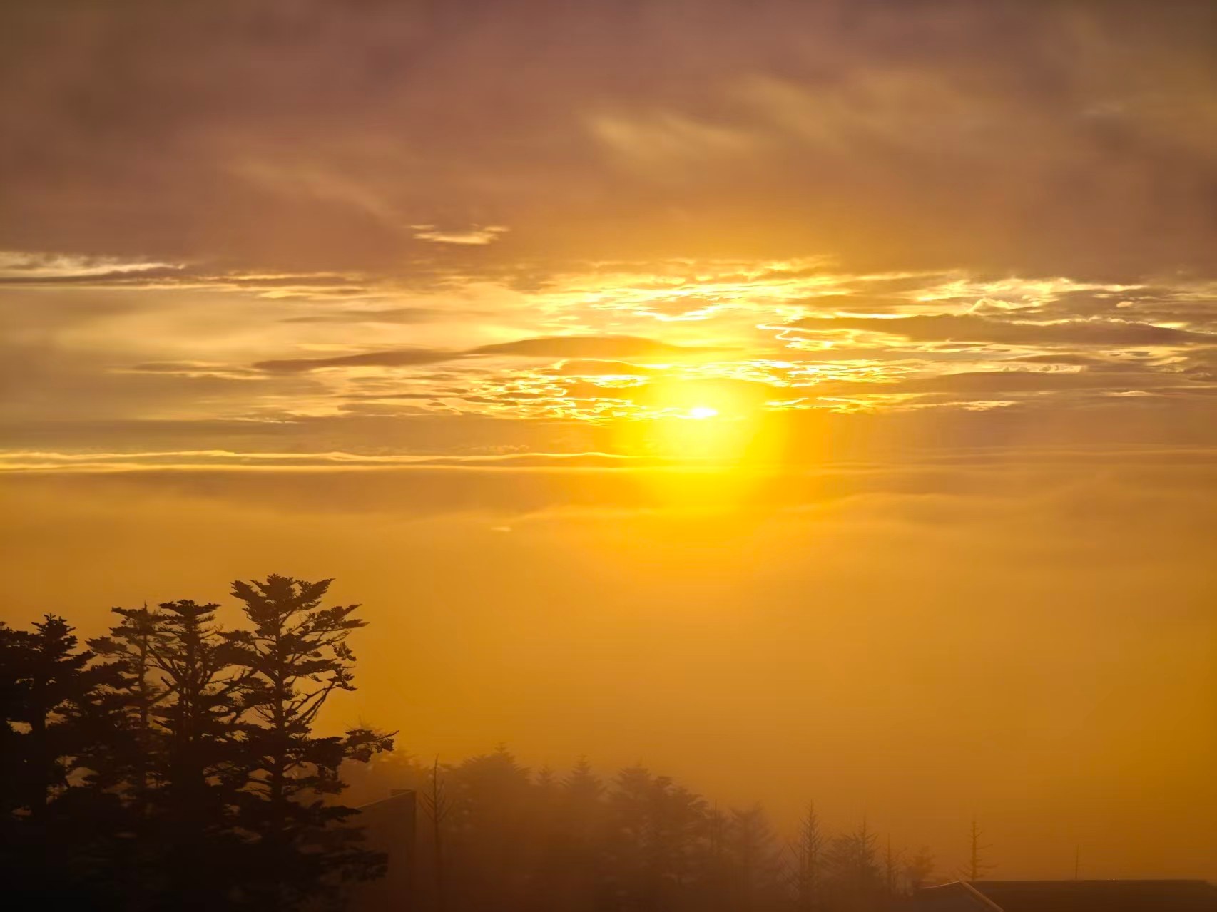 夕阳如金色画布铺展在天际。云雾缭绕,轻柔的薄云被夕阳的光辉染成温暖的橙黄,宛如一件镶满金线的华丽外衣。凌空而起的树木剪影点缀在前景,披上了静谧的暮色,透出几分宁静与神秘。天地间弥漫着金色的光雾 ...