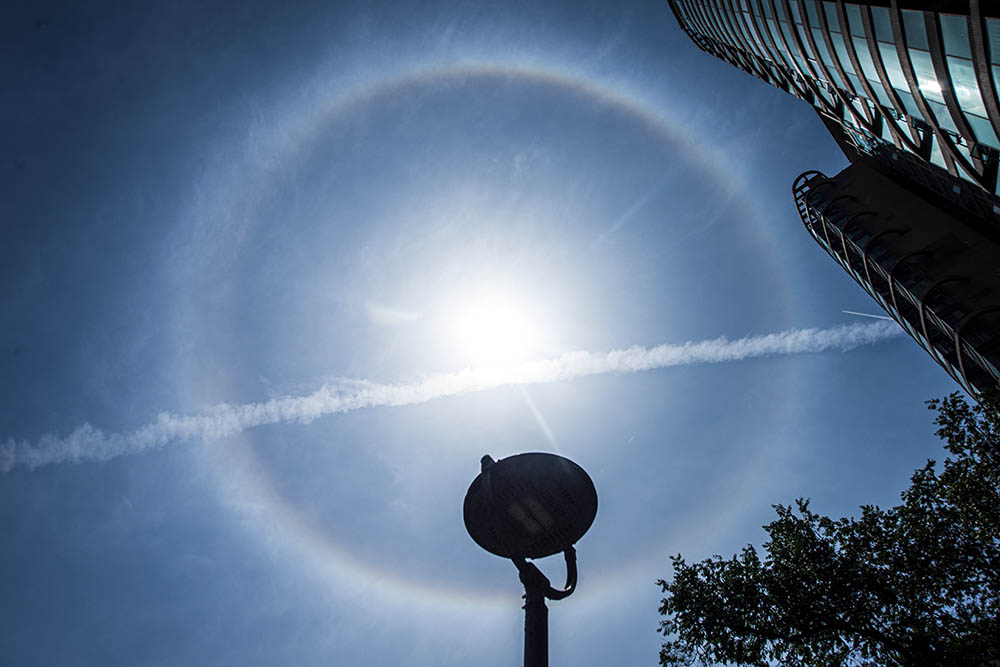 上午时分,四川乐山城区上空,湛蓝天空如澄澈画布铺展。太阳似异瞳眼眸,倾洒璀璨光芒,绚丽日晕如 ...