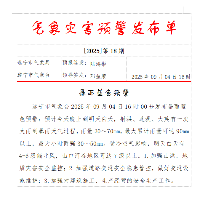 遂宁市气象台2025年09月04日16时00分发布暴雨蓝色预警:预计今天晚上到明天白天,射洪、蓬溪、大英有一次大雨到暴雨天气过程,雨量30~70mm,最大累计雨量可达90mm以上,最大小时雨强30~50mm。受冷空气影响,明天白天有4-6级偏北风,山口河谷地区可达7级以上。