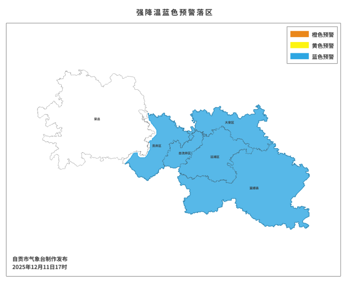 自贡市气象台2025年12月11日17时00分发布强降温蓝色预警:受地面冷空气影响,预计12月12日傍晚开始到14日我市有一次强降温天气过程,市区和富顺县日平均气温将累计下降6℃,荣县将下降5℃,12日傍晚到晚上有5~6级偏北风,13日到14日以多云到晴天气为主,各区县凌晨到早上最低气温将下降至3℃左右,低山区有霜冻。