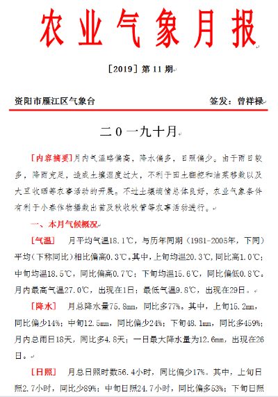 月内气温略偏高,降水偏多,日照偏少。由于雨日较多,降雨充足,造成土壤湿度过大,不利于田土翻挖和油菜移栽以及大豆收晒等农事活动的开展。不过土壤墒情总体良好,农业气象条件有利于小春作物播栽出苗及秋收秋管等农事活动进行。