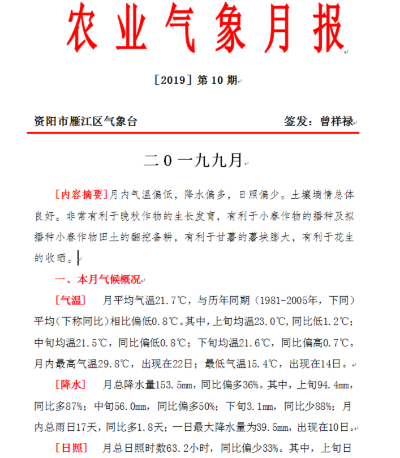 月内气温偏低,降水偏多,日照偏少。光温水较匹配,无常年性的秋季连阴雨,光热充足,雨晴相间,土壤墒情总体良好。非常有利于晚秋作物的生长发育,有利于小春作物的播种及拟播种小春作物田土的翻挖备耕,有利于甘薯的薯块膨大,有利于花生的收晒。